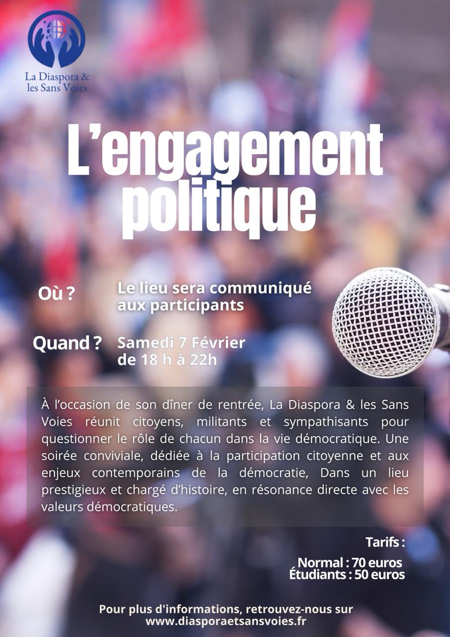 À l’occasion de son dîner de rentrée, le parti La Diaspora & les Sans Voies, vous convie à une soirée d’échanges et de réflexion autour d’un thème fondamental : l’engagement politique.